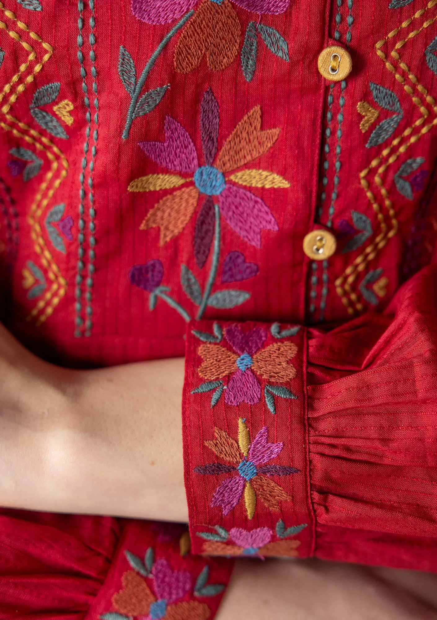 Kangastunika, jonka miehustassa, hihansuissa ja boordina helmassa on kauniit kirjailut. Pitkät hihat sekä edessä kaarroke ja rypytys. Pyöreä, kontrastivärisellä nauhalla kantattu pääntie. Kontrastiväriset kangaspäällysteiset napit kaarrokkeessa ja hihansuissa.