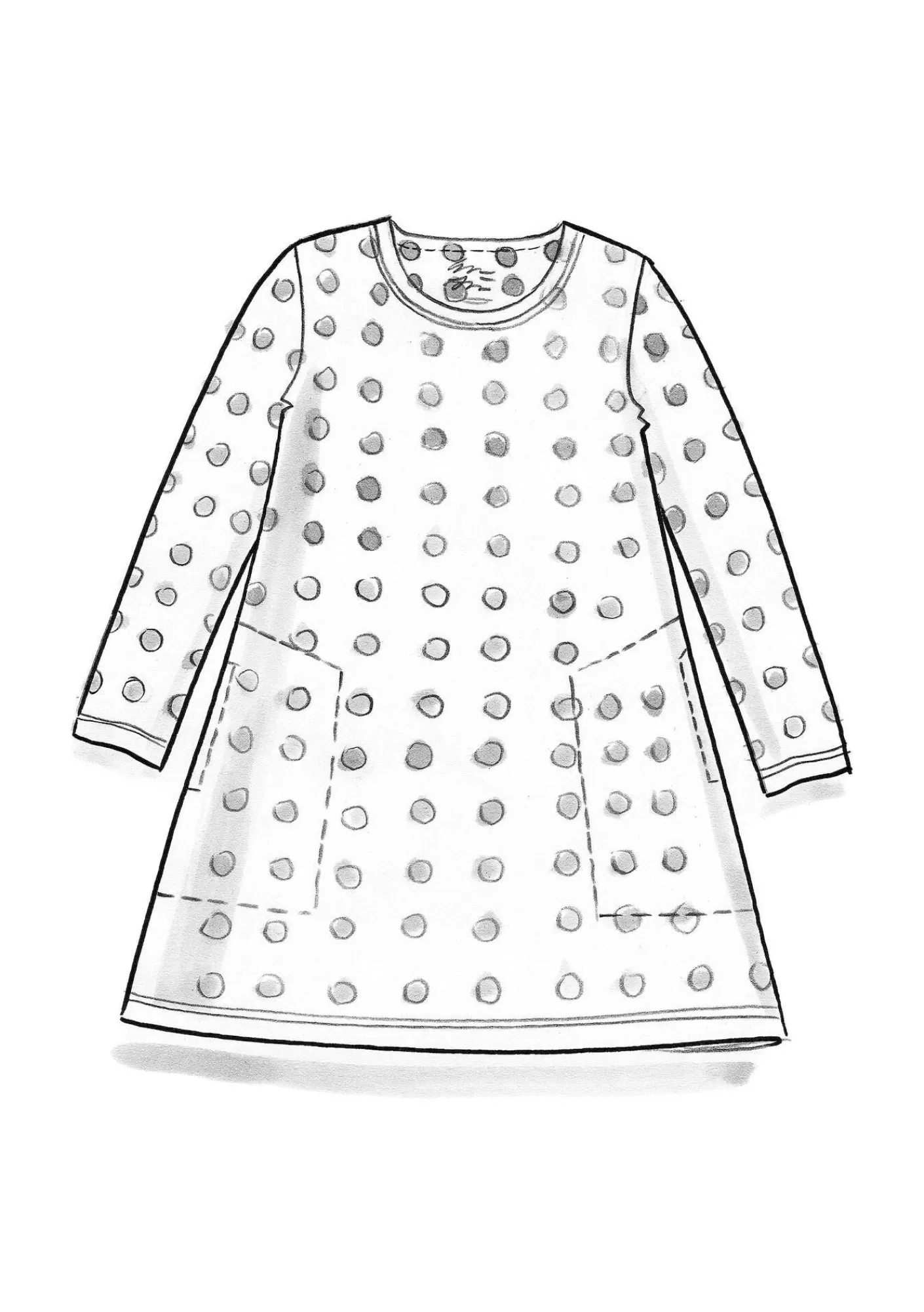 Pelkistetty malli, pyöreä pääntie ja sivutaskut. Täyspitkät hihat. Valittavana on sekä yksivärisiä että painetulla pilkkuaiheisella ”Tyra”-kuviolla somistettuja versioita. Kevyesti alaspäin levenevä helma.
